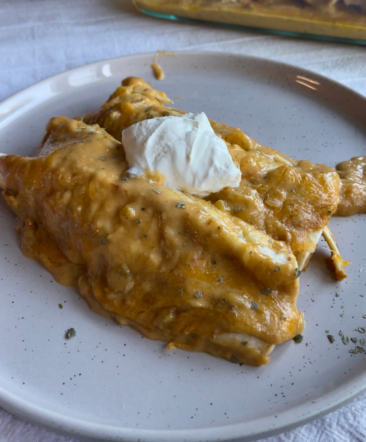 Add in the diced green chilis, sour cream, and Monterey Jack cheese. Add in the spices listed above. Make sure to taste test!
